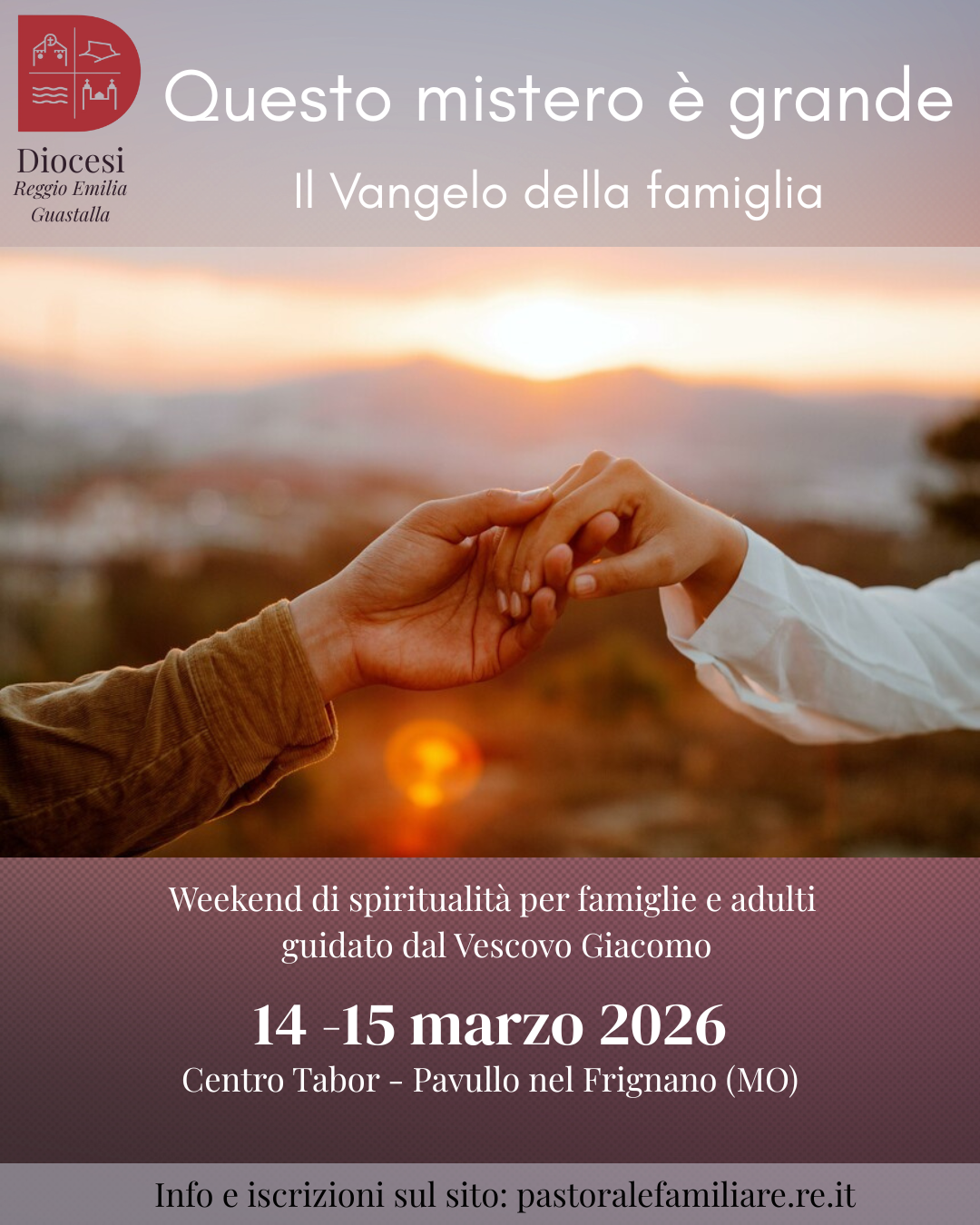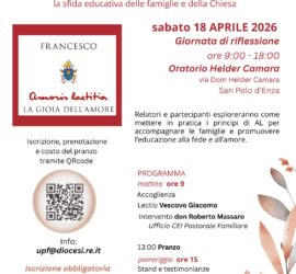 COMPILA IL MODULO DI ISCRIZIONE Alcune note e informazioni Sabato 18 aprile 2026 Oratorio Helder Camara – San Polo d’Enza Dalle 9:00 alle 18:00 A 10 anni dalla pubblicazione dell’esortazione apostolica Amoris Laetitia, la Diocesi di Reggio Emilia-Guastalla propone una giornata di riflessione e confronto dal titolo: “Generare alla fede […]
